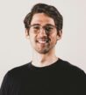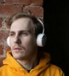 A wooden table holds a sleek black phone stand with a smartphone displaying a webpage featuring a portrait photo and introductory text in sleek typography. To the right, there's a white ceramic vase with a geometric pattern containing bright yellow and green decorative plants, contributing a pop of color. The background is soft and neutral, creating a serene atmosphere.